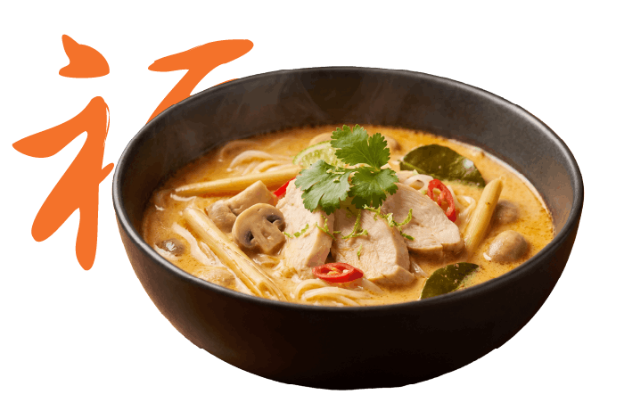 tajska zupa na bazie mleka kokosowego i curry, z kurczakiem, makaronem ryżowym i naszymi dodatkami