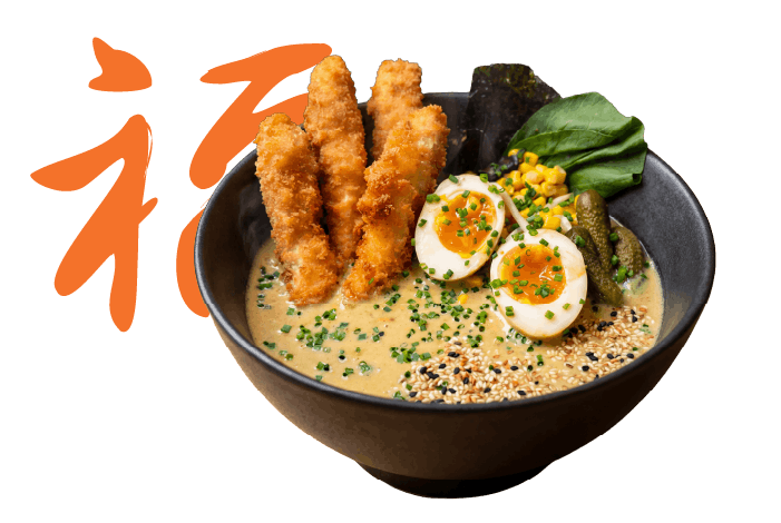 wywar drobiowy, curry tare, kurczak w panko, makaron pszenny, jajko, pikle, pak choi, goma wakame, kiełki, kukurydza, nori, zielona cebulka