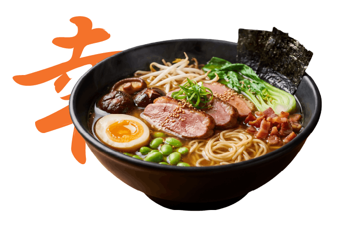 wywar drobiowy, shoyu tare, pierś kaczki, makaron pszenny, jajko, shitake, pak choi, edamame, kiełki, bekon, nori, zielona cebulka, sezam