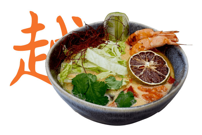 tajska zupa na bazie mleka kokosowego i curry, z krewetkami, makaronem ryżowymi i naszymi dodatkami